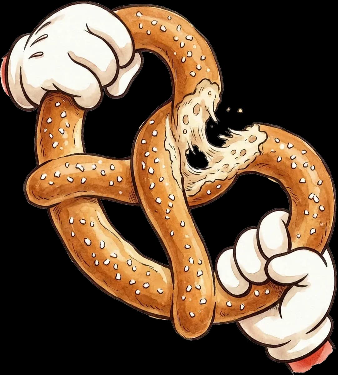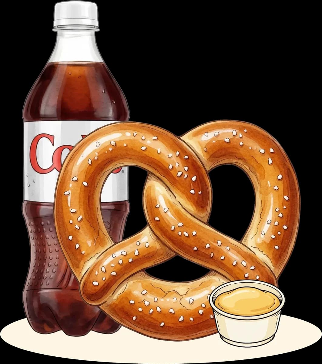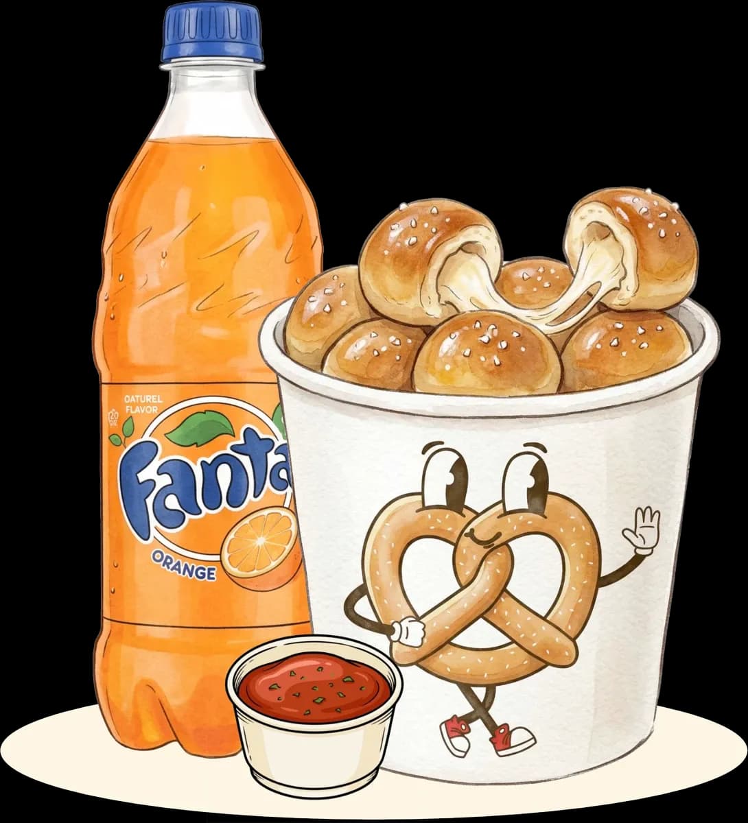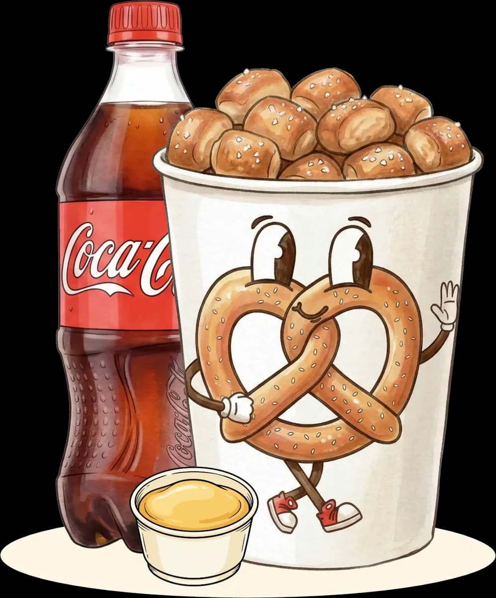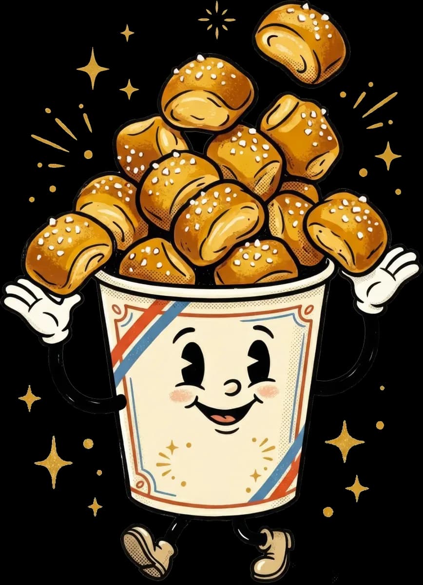 A small-shop pretzel bakery with soft pretzels, mini dogs, and mozz-stuffed bites. Baked fresh on the counter, served across it.